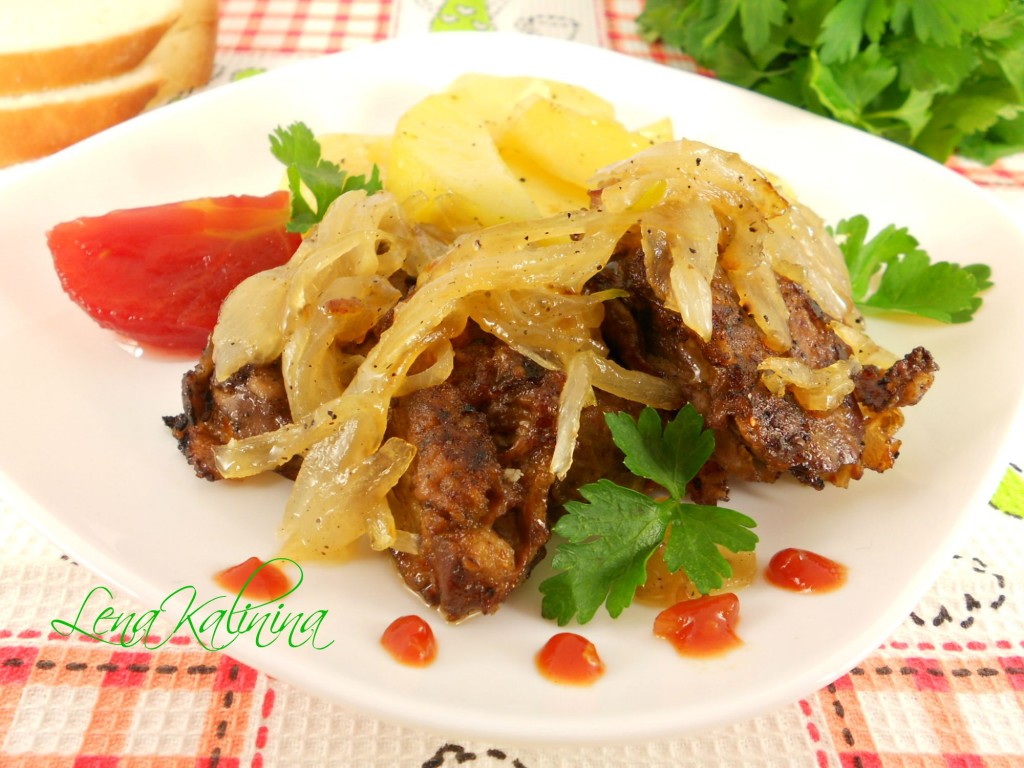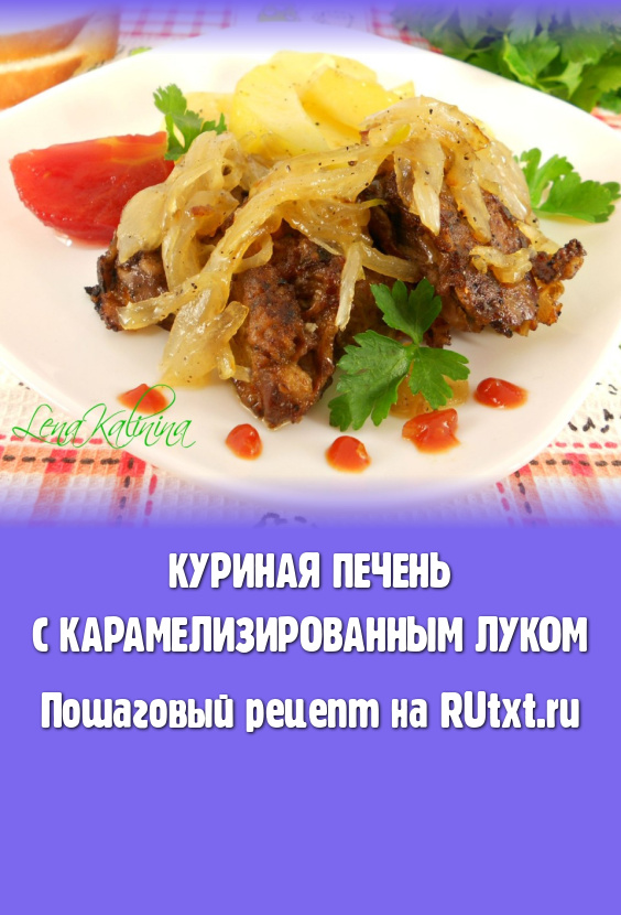 Готовую куриную печень переложить на блюдо, сверху выложить карамелизированный лук и можно подавать к столу. Уверена, сочетание нежной печёнки и жареного лука непременно вам понравится!