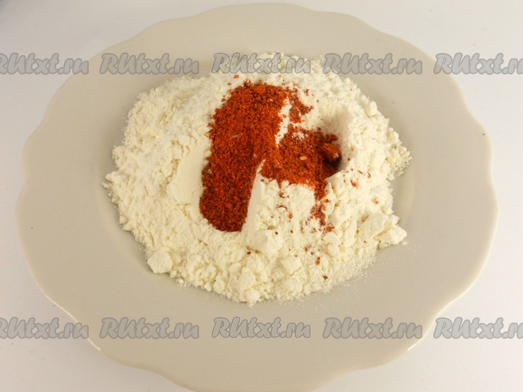 Лук очистить, нарезать на тонкие полукольца. Печень промыть холодной водой, разрезать пополам. Муку насыпать на тарелку, добавить паприку, перемешать.