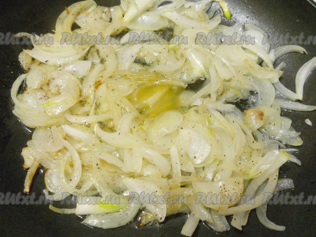 Пока жарится печёнка, на другой сковороде разогреть растительное масло, выложить полукольца лука и обжарить на среднем огне, помешивая, до золотистости. Затем добавить мёд, перемешать и обжаривать ещё 3-4 минуты, периодически перемешивая. Немного посолить и поперчить карамелизированный лук.