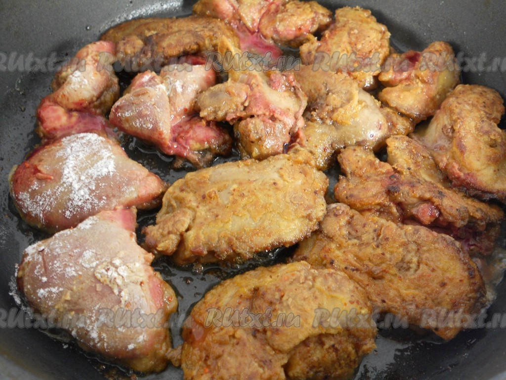 Куриную печёнку посолить и поперчить, обвалять со всех сторон в смеси муки и паприки. Масло растительное разогреть на сковороде и выложить печень. Обжаривать в течение 7-10 минут (до готовности) на среднем огне, периодически переворачивая. Для того чтобы проверить готовность, просто разрежьте ножом кусочек печени, если выделяется прозрачный сок (без примесей крови), значит печёнка готова. Долго передерживать печень на огне не нужно, иначе она станет суховатой.