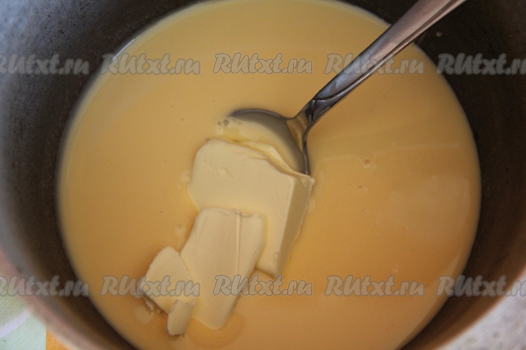 В алюминиевой (или другой жаропрочной) кастрюле соединить сгущёнку и сливочное масло, поставить на медленный огонь и, постоянно и интенсивно перемешивая венчиком (или ложкой), растопить и варить, не переставая помешивать, до образования карамельной массы (мне на варку потребовалось минут 15, готовая карамель должна немного потемнеть, но и слишком тёмной она быть не должна, иначе карамель получится жёсткой, можно, говоря о готовности карамели, ориентироваться и на консистенцию карамели - готовая карамель будет отставать от стенок кастрюльки, как хорошо замешанное тесто, но при этом она должна оставаться мягкой).