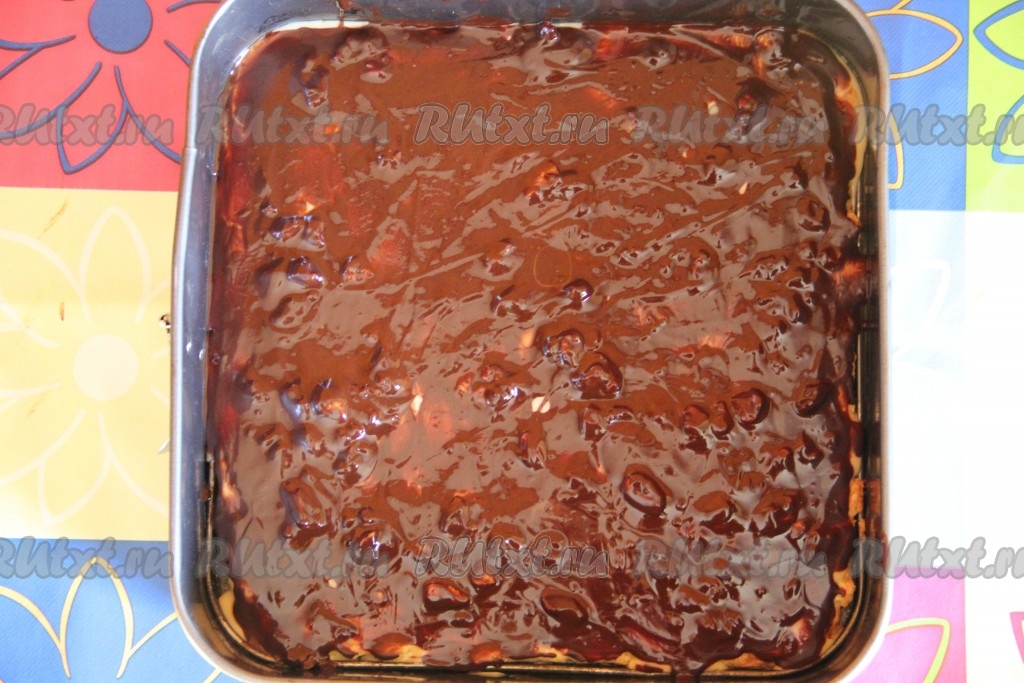 Горячую карамель, приготовленную из сгущённого молока и сливочного масла, равномерно распределить по готовому песочному коржу (остывшую карамель нанести на корж не получится), дать затвердеть.