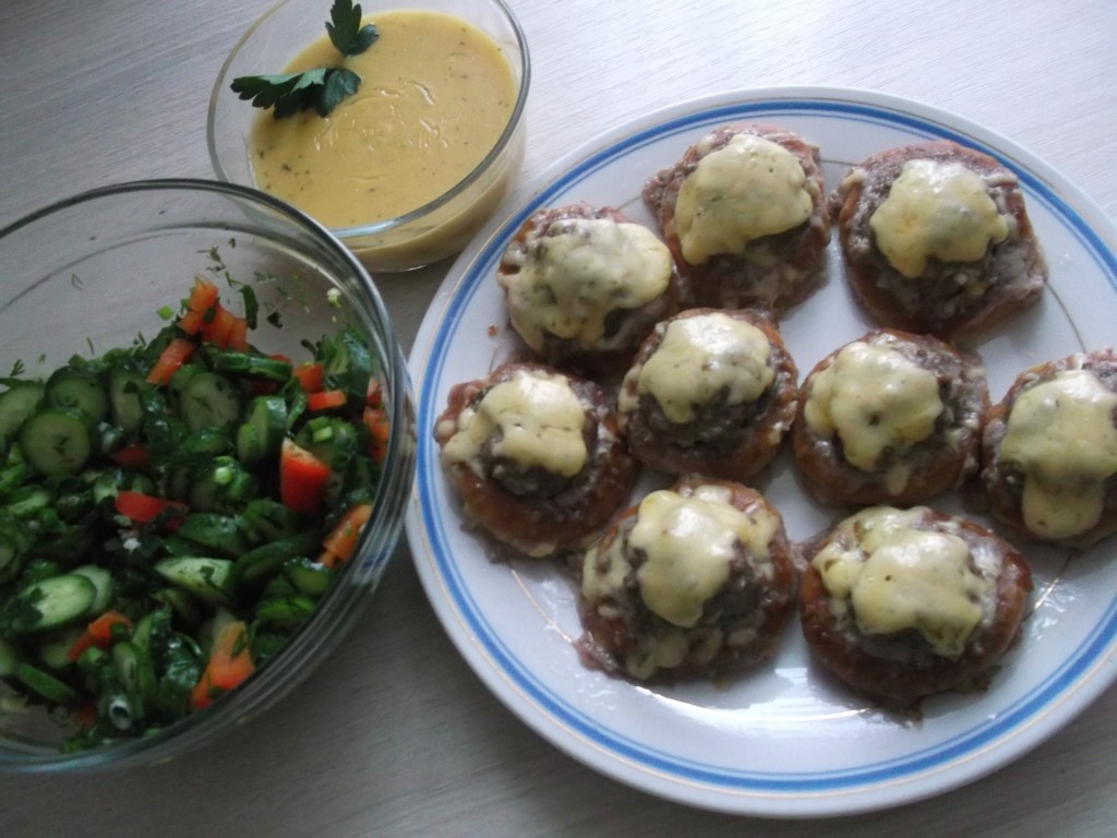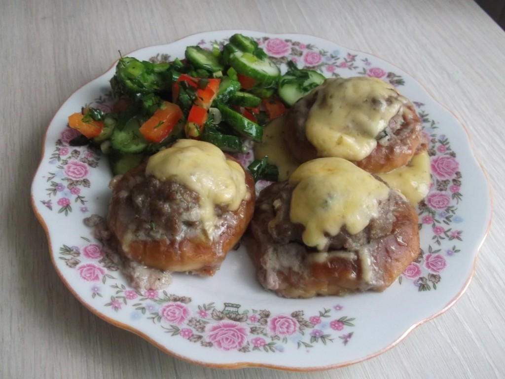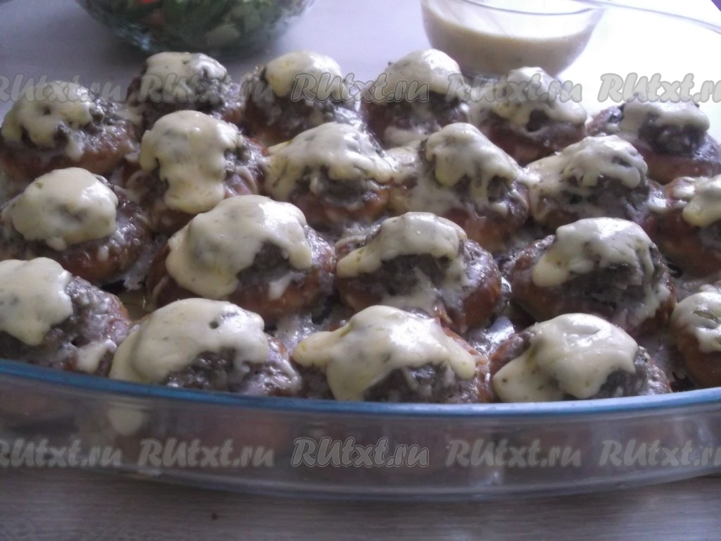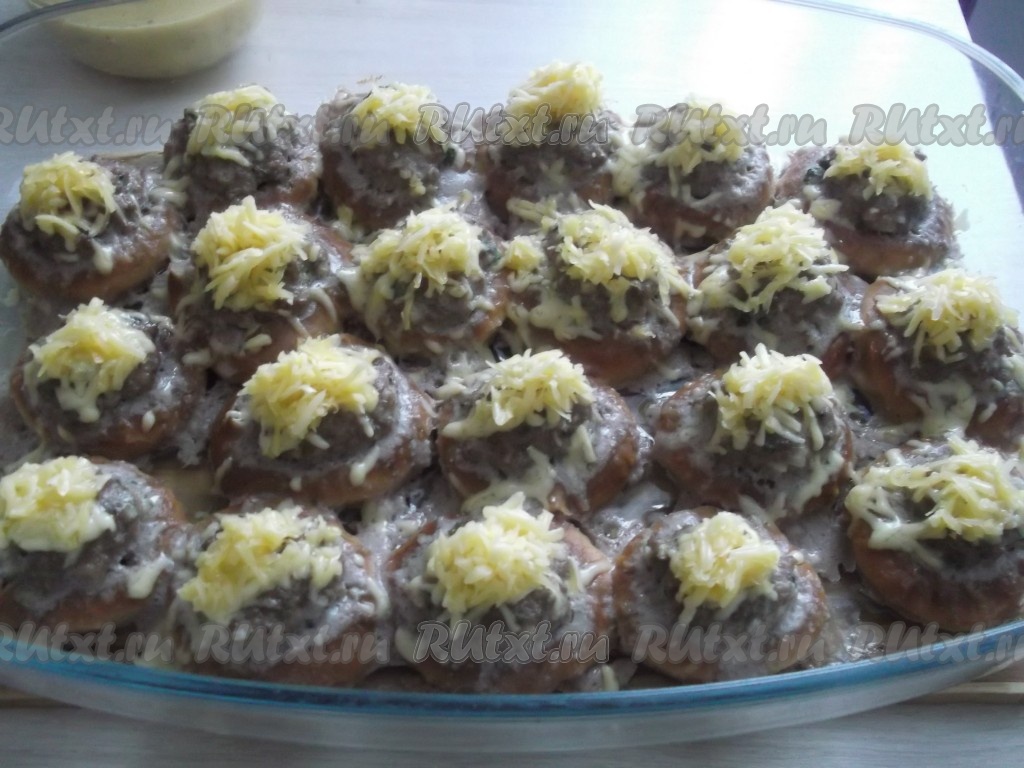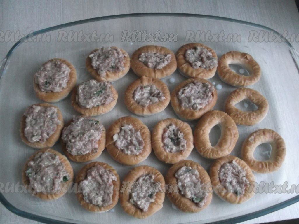 Заполняем все сушки фаршем и ставим форму в духовку, разогретую до 180 градусов, на 15 минут.