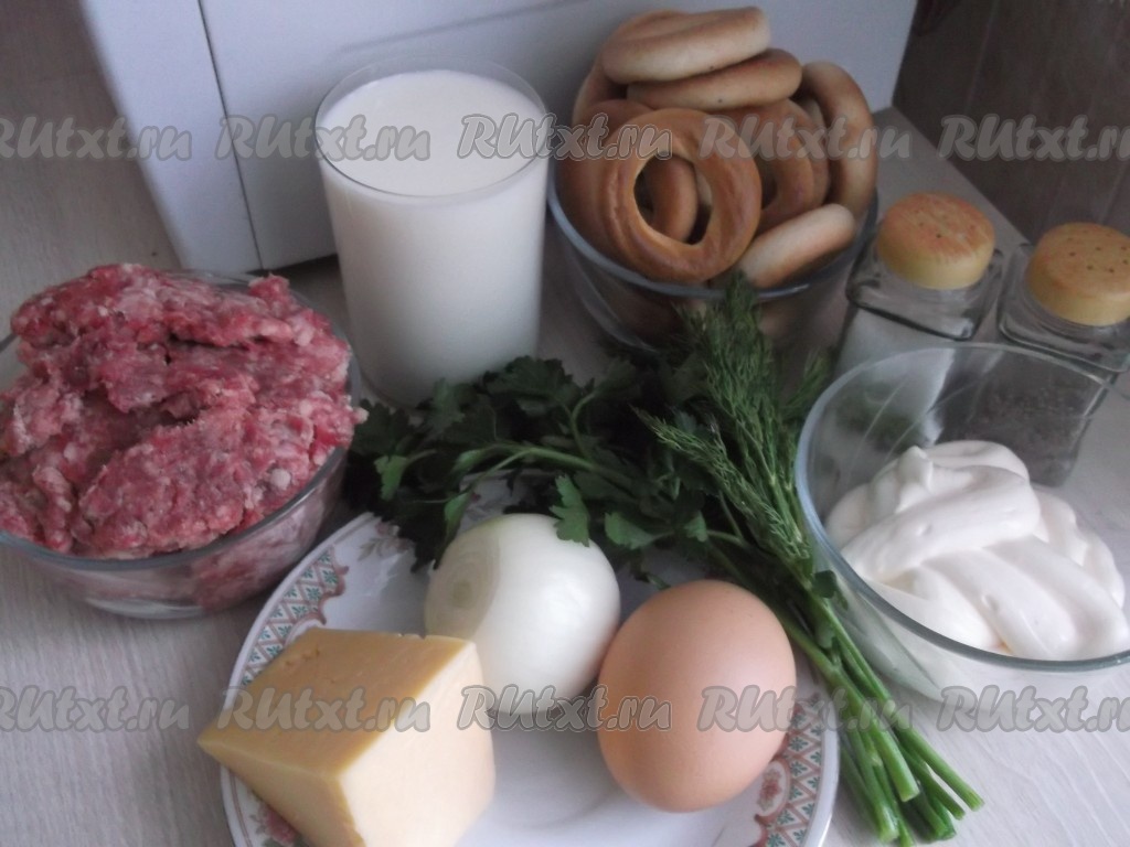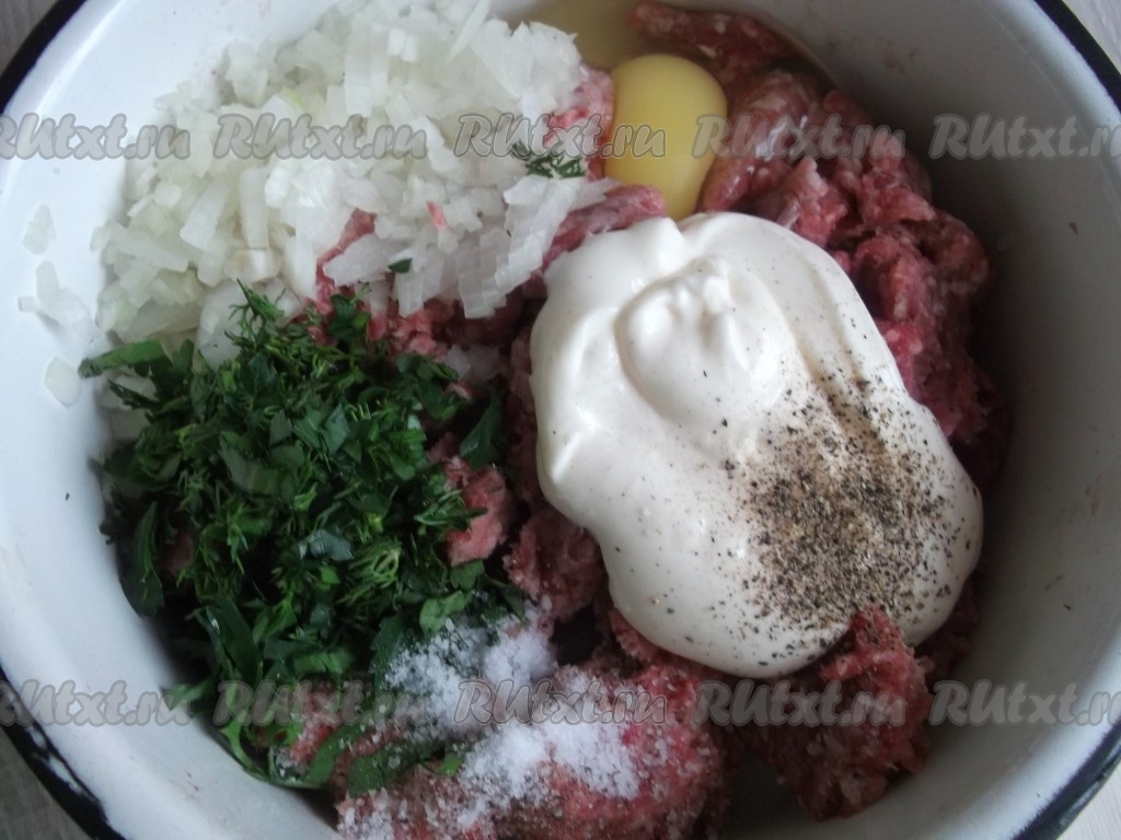 Смешиваем фарш, лук, чеснок, зелень, яйцо, соль, перец, майонез или сметану.