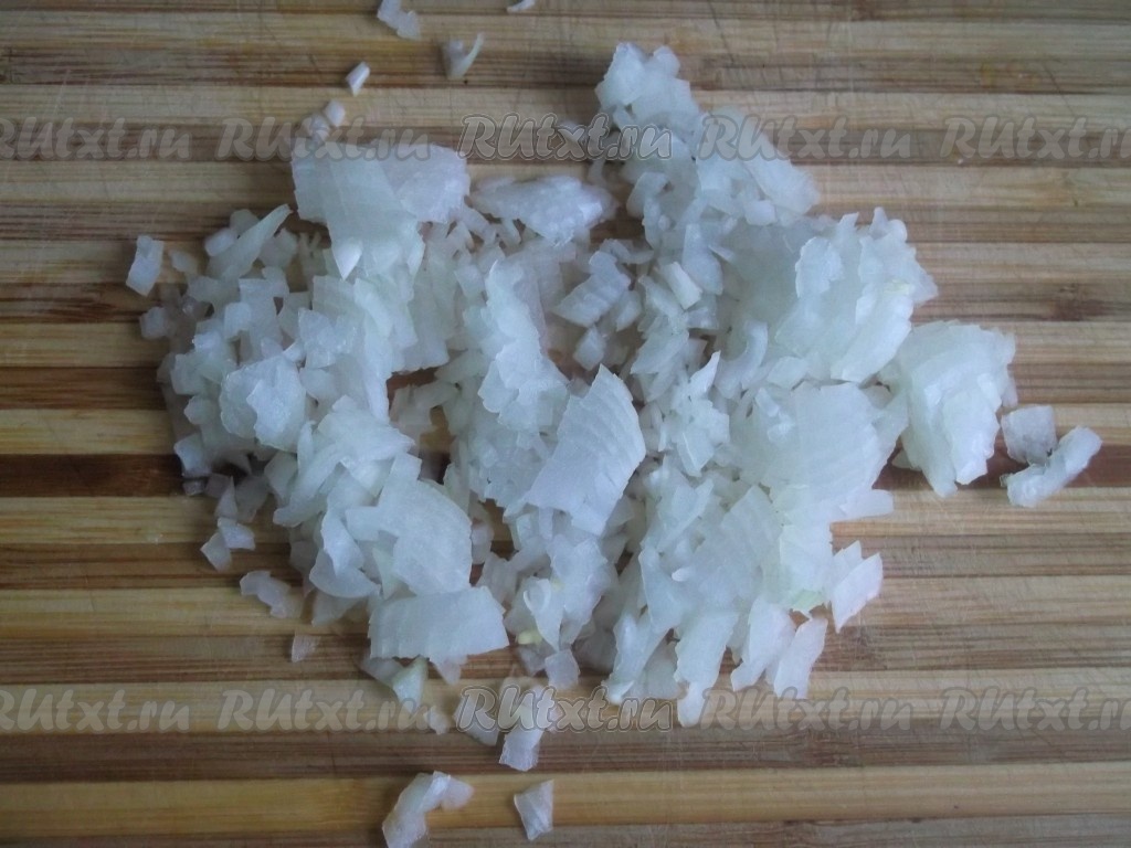 Пока сушки у нас в молоке, займёмся фаршем. Мелко режем лук и чеснок.