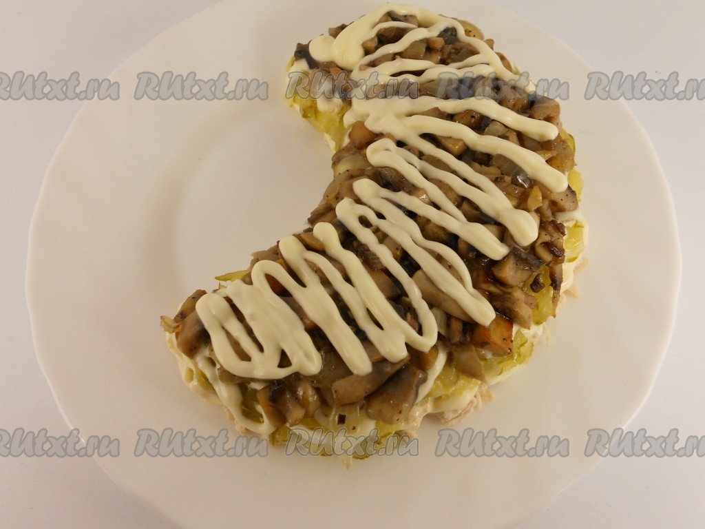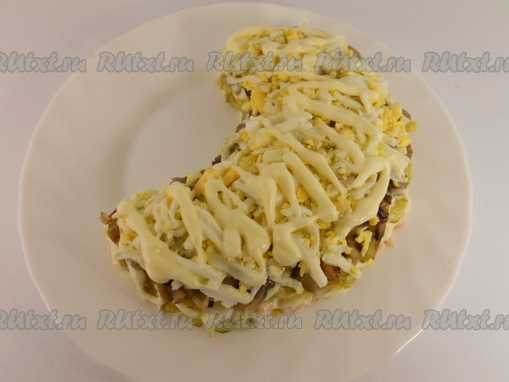 Обжарить грибы вместе с измельченным луком на растительном масле, посолить и поперчить. Остудить и выложить третьим слоем.