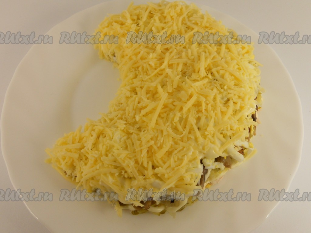 Сыр натереть на крупной терке и выложить сверху салата верхним слоем. Майонезом не смазывать!