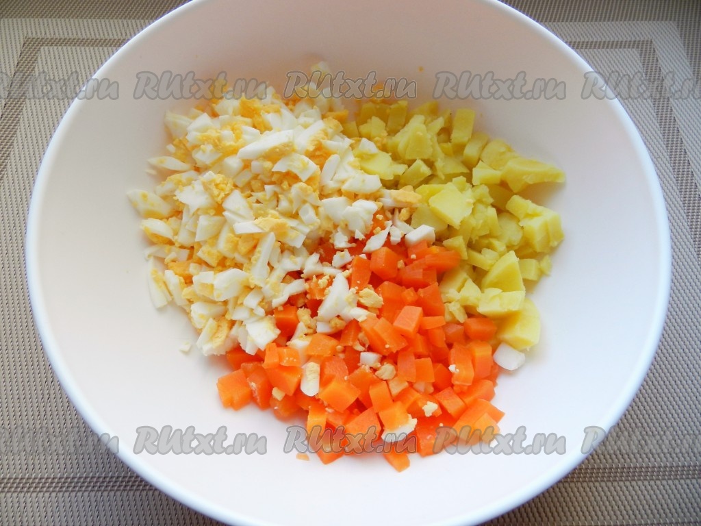 Картофель, морковь и яйца очистить, нарезать на кубики примерно одинакового размера, выложить в глубокую миску.