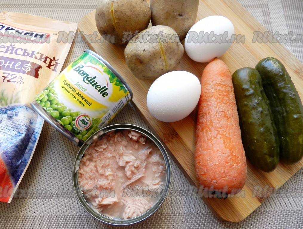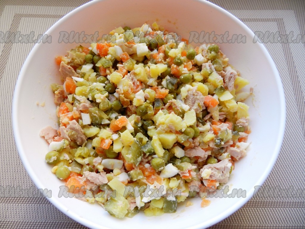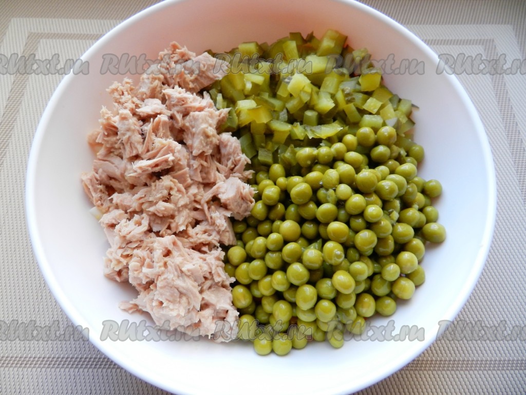 Нарезать солёные (или маринованные) огурцы на кубики такого же размера, как были нарезаны варёные овощи и яйца. С тунца слить всю лишнюю жидкость, размять рыбу вилкой. В миску с нарезанными овощами и яйцами добавить огурцы, тунца и горошек без жидкости.