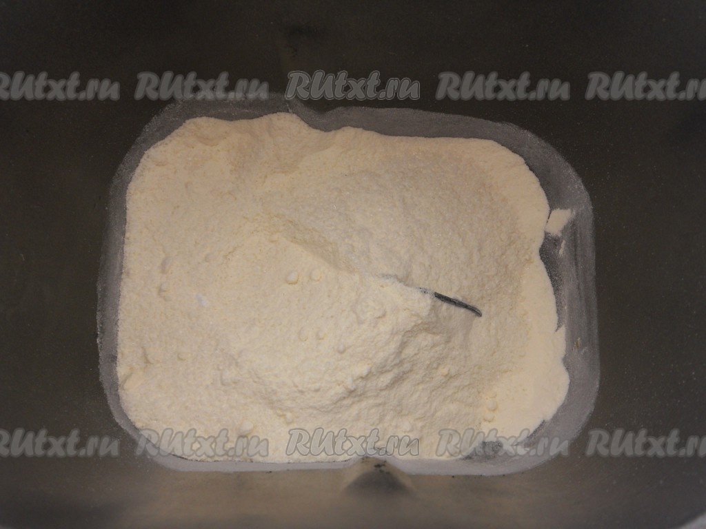 В ведёрко хлебопечки всыпать сахар и сухое молоко (если имеются комки, то можно просеять сахар и сухое молоко через сито).