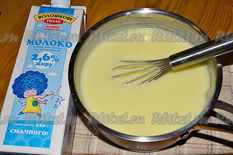 Приготовить пудинг: развести содержимое пакетов в 5-6 столовых ложках молока, добавить сахар, влить смесь, помешивая, в закипевшее молоко.