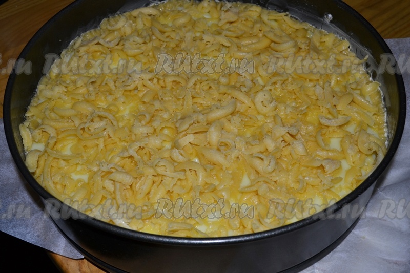 На яблоки вылить горячий пудинг, а сверху натереть замороженное тесто.