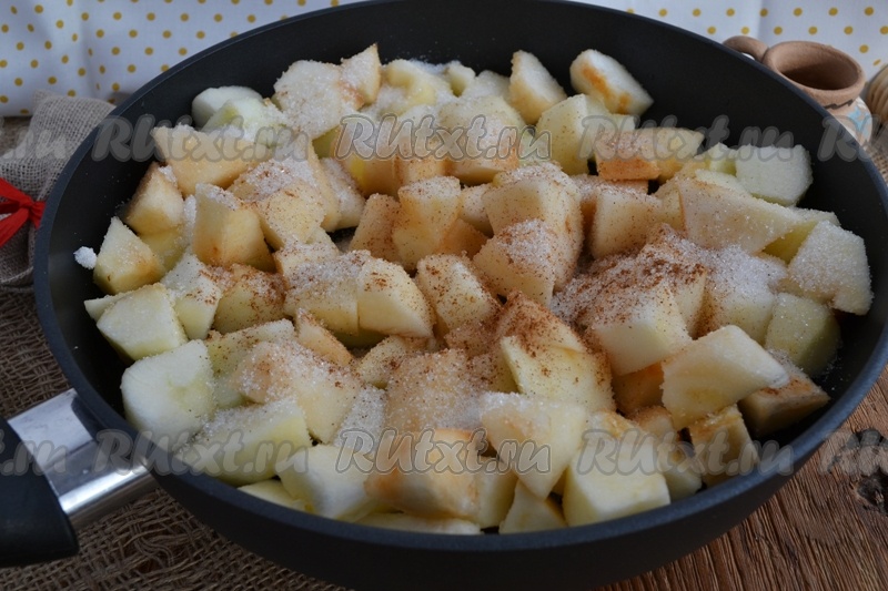 Яблоки почистить, нарезать крупными кусками, выложить на разогретую сковороду, добавить 2-3 ложки сахара и корицу, тушить на среднем огне примерно 5-10 минут.