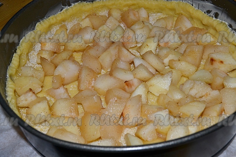 Выложить яблоки равномерно в форму на тесто.