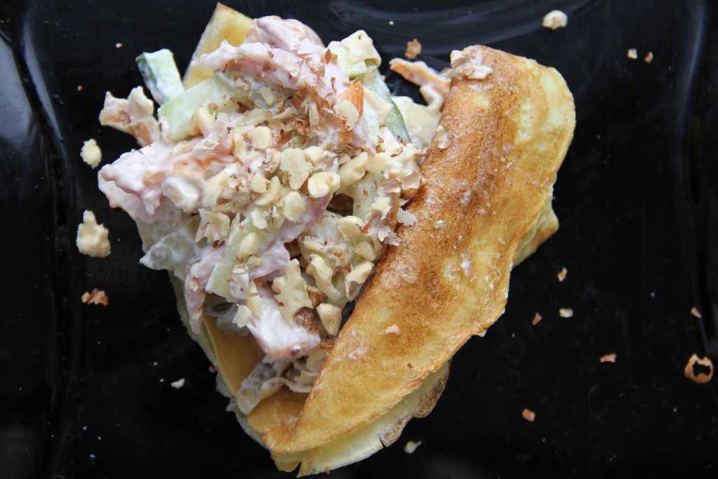 Орехи измельчить, добавить их в салат к блинам и копченой курице, заправить все майонезом. Блюдо получается очень вкусным и нежным.