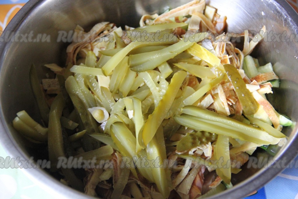 Маринованные огурцы нарезать соломкой, отжать от лишнего сока и добавить в миску с салатом.