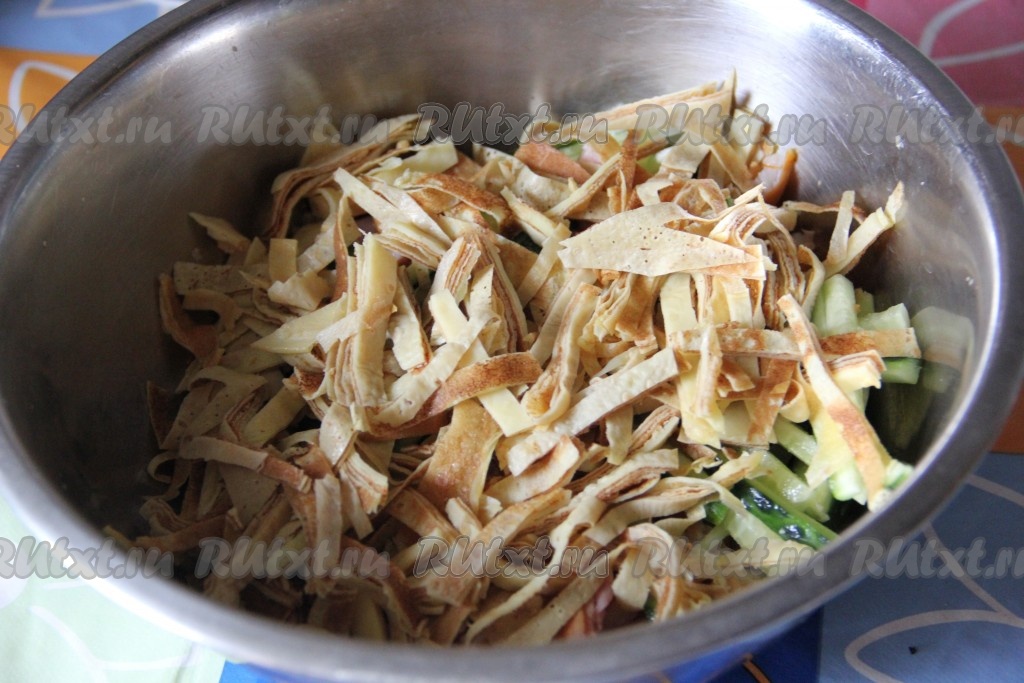 Свежий огурец и блинчики нарезать соломкой и добавить к копченому куриному мясу.