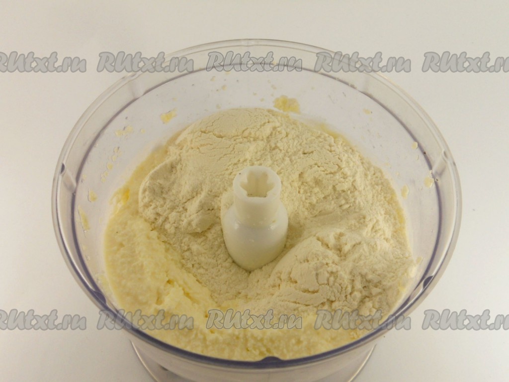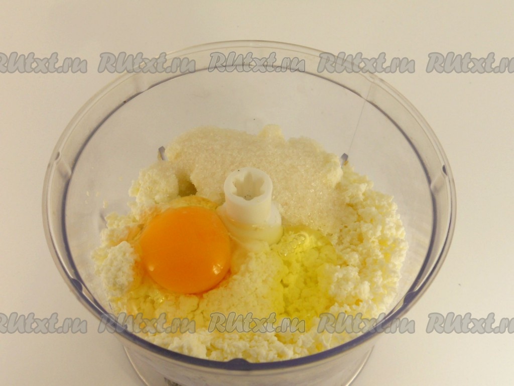 В чашу блендера поместить творог (если творог сухой, добавьте 1-2 ложки сметаны), добавить яйцо, сахар и соль.