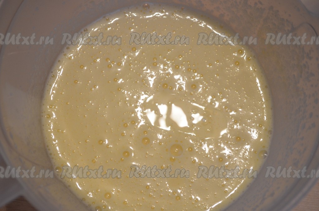 Яйца взбить с сахаром и солью в пышную массу. Влить масло.