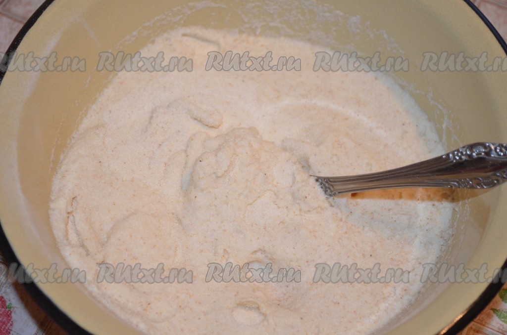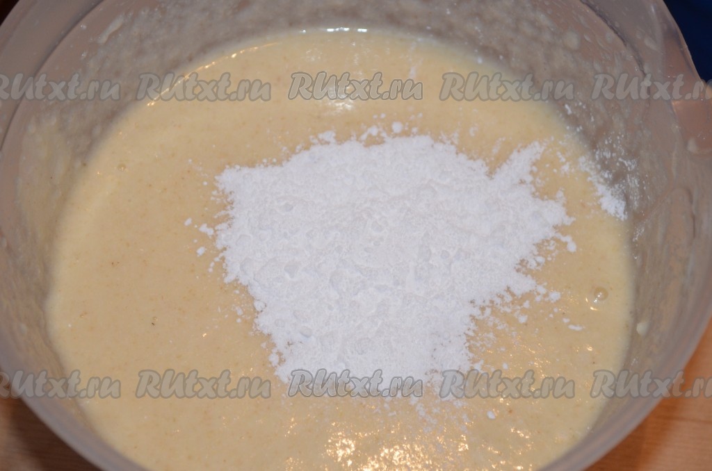Оставить на 15 минут. Затем добавить разрыхлитель, перемешать.