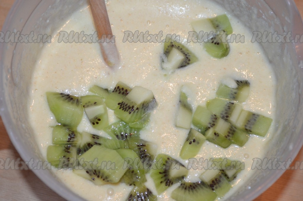 Киви почистить, нарезать кусочками, добавить в тесто. Аккуратно перемешать. Можно готовить и без киви.