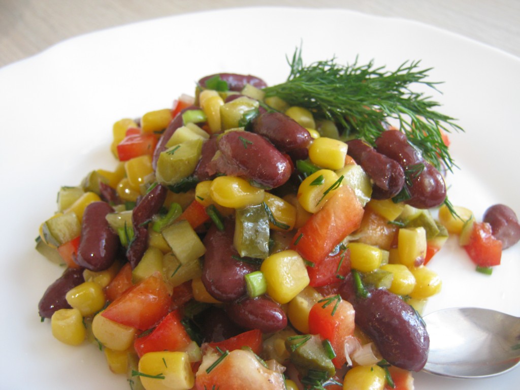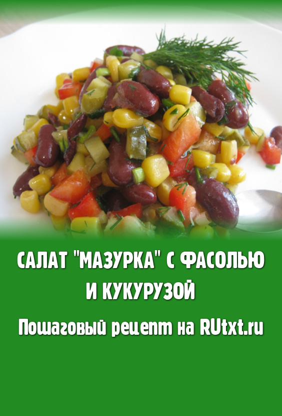 Предлагаю приготовить сытный, вкусный и красочный салат с фасолью и кукурузой "Мазурка". Для этого блюда не надо отваривать или запекать ни один из ингредиентов. Готовится салат за считанные минуты, а получается отличным!