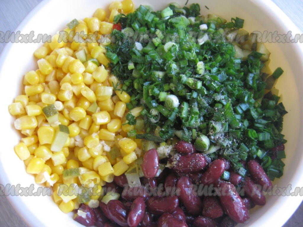 Хорошо перемешиваем, перекладываем в салатник и подаём вкусный, яркий, сытный салат "Мазурка" с фасолью и кукурузой к столу