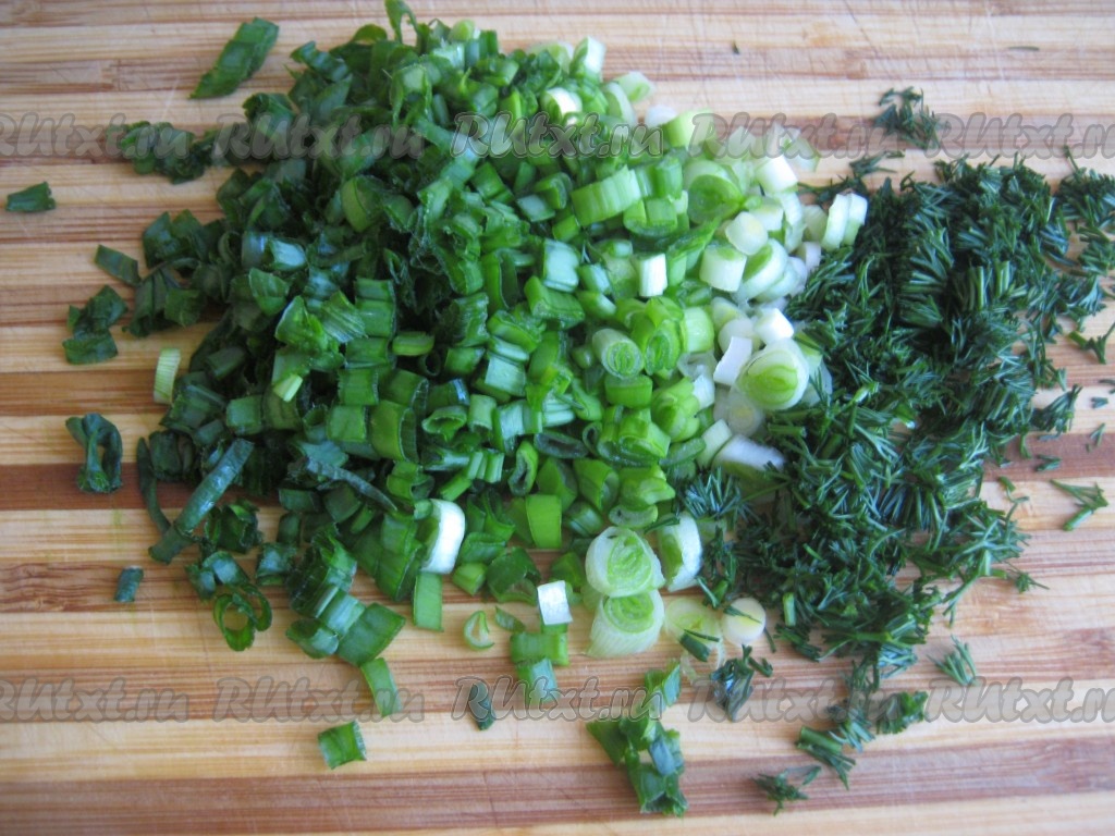 Зелёный лук и укроп моем, нарезаем мелко