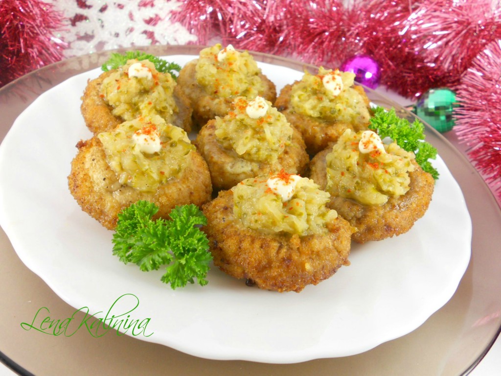 Поместить шампиньоны в разогретое масло внешней стороной вниз. В углубления сверху влить по 0,5 чайной ложки оставшейся яичной смеси. Накрыть сковороду крышкой и жарить на небольшом огне около 10 минут, пока яичная смесь загустеет. Выложить готовые шампиньоны на тарелку, сверху разместить по ложке подготовленной начинки. Украсить по желанию. Дать этой вкусной, необычной и пикантной закуске из шампиньонов немного остыть и можно подавать к столу!