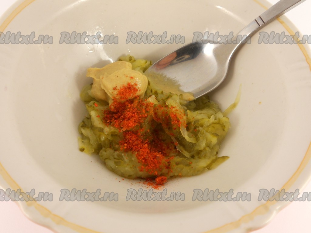 Приготовить начинку: маринованные огурцы натереть на крупной терке, отжать жидкость. Добавить горчицу и паприку, посолить по вкусу, хорошо перемешать.