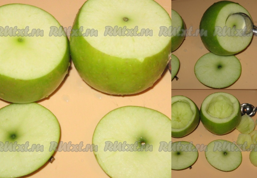 Яблоки вымыть, обсушить бумажным полотенцем, срезать ножом верхушки (их не выбрасывать - это будут крышечки!), аккуратно фруктовой ложечкой вычистить сердцевину и немного яблочной мякоти (мякоть тоже оставить - для начинки). Должны получиться полые горшочки.