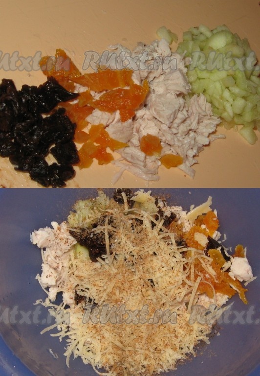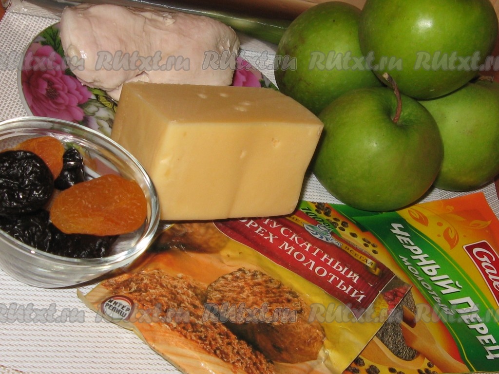Чернослив и курагу хорошо вымыть, обсушить, нарезать маленьким кубиком, филе курицы мелко нарезать поперек волокон, яблочную мякоть мелко порезать - все ингредиенты соединить, добавить сыр, натертый на мелкой терке, соль, перец, мускатный орех, перемешать.