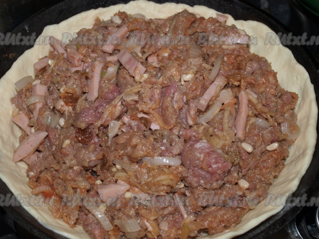 Форму смазать маслом, застелить тестом дно и бока. Выложить на тесто начинку из фарша.