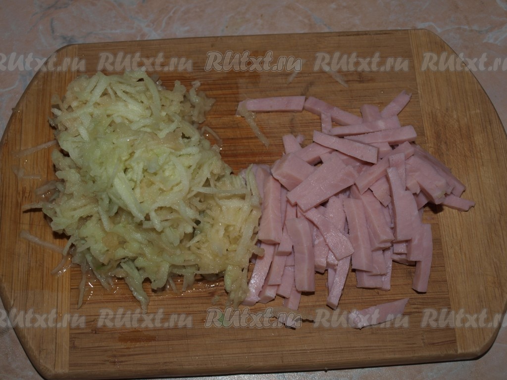 Ветчину нарезать тонкой соломкой, яблоко натереть на крупной тёрке, чеснок очистить и раздавить.
