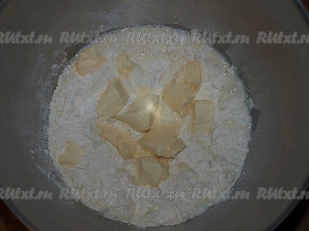 Просеять муку, разрыхлитель и соль. Влить туда молоко, добавить размягчённое сливочное масло.