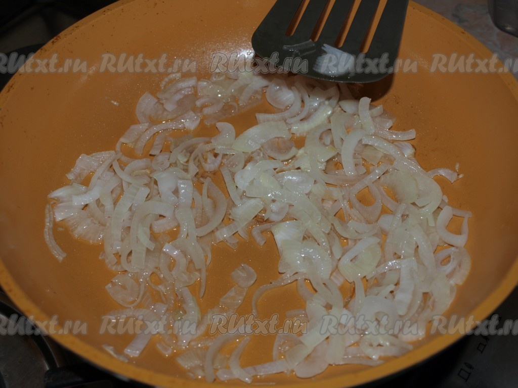 Лук очистить, нашинковать полукольцами. Обжарить на растительном масле 5-6 минут.