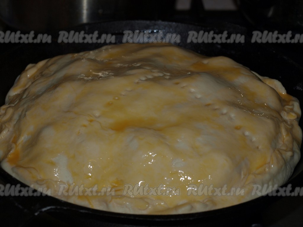 Оставшееся тесто раскатать, накрыть пирог, защипнуть края. Наколоть поверхность итальянского мясного пирога вилкой, смазать желтком. Выпекать 50-55 минут.