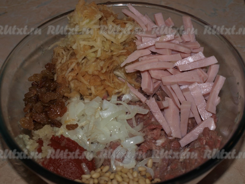 Смешать мясной фарш с чесноком, томатной пастой, цедрой, жареным луком, яблоком, орешками, изюмом и ветчиной. Приправить солью и перцем.