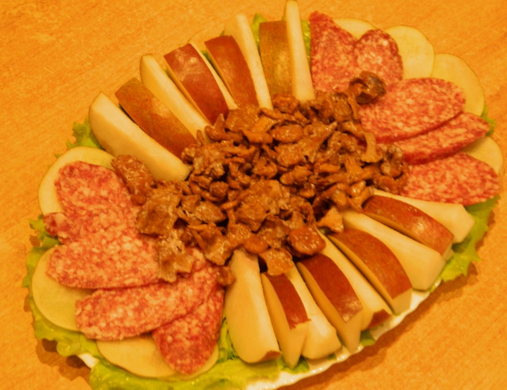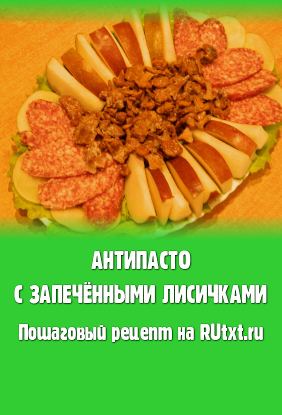На блюдо выложить листья салата, нарезанную колбасу, груши, запеченные лисички и можно подавать антипасто к столу.
