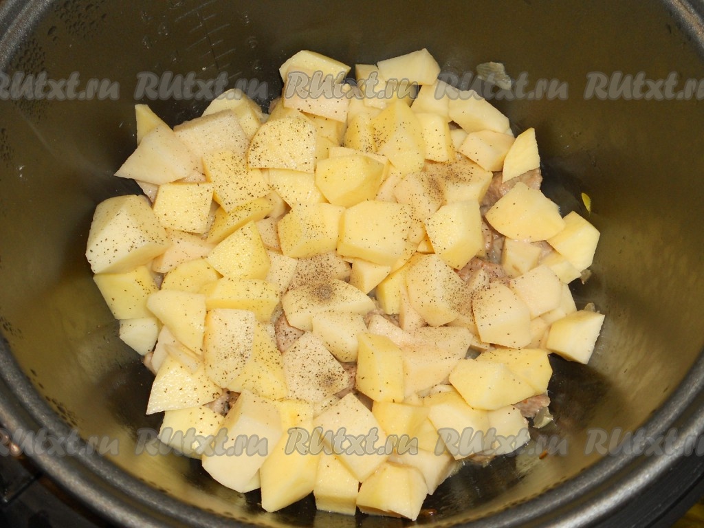 На мясо выложить подготовленный картофель. Посолить и поперчить.