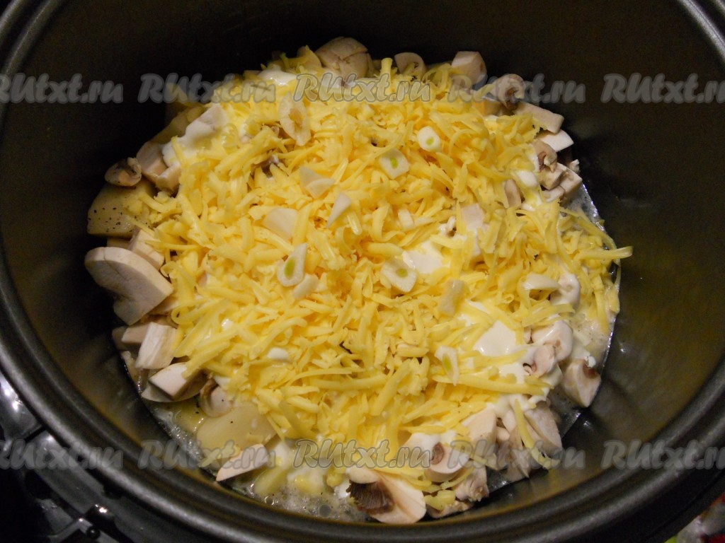 На картофель выложить шампиньоны. Влить 3 мультистакана (или 480 мл) воды. Полить сверху сметанно-майонезной смесью, посыпать тертым сыром и добавить чеснок, порезанный небольшими кусочками.
