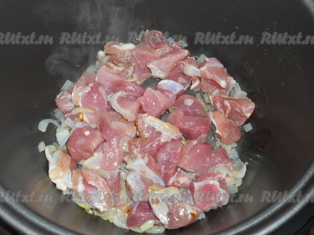 В чашу мультиварки влить растительное масло и выложить лук. Обжарить в режиме мультиварки "Поджаривание" в течение 6-7 минут. Добавить свинину и обжаривать на том же режиме еще 5-7 минут.