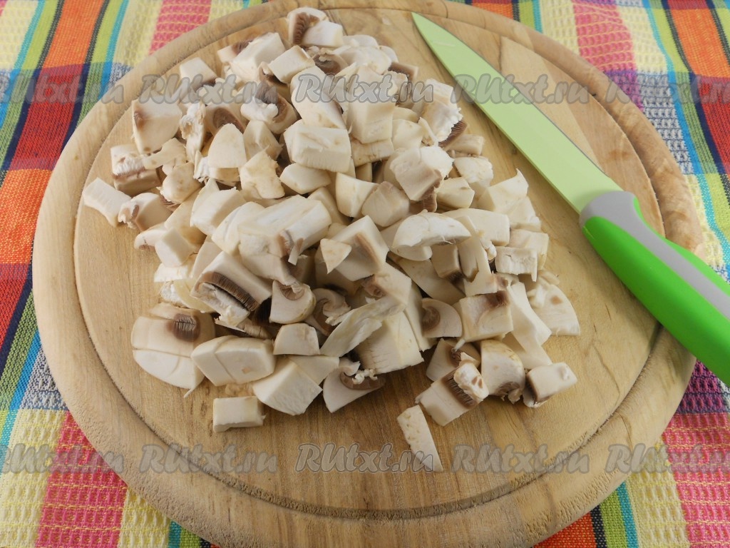 Шампиньоны нарезать небольшими кусочками.