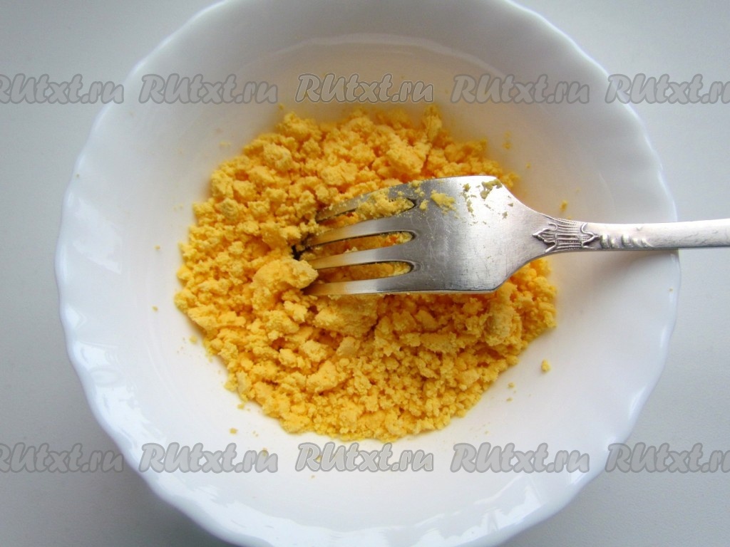 Желтки выложить в глубокую тарелку, размять вилкой.
