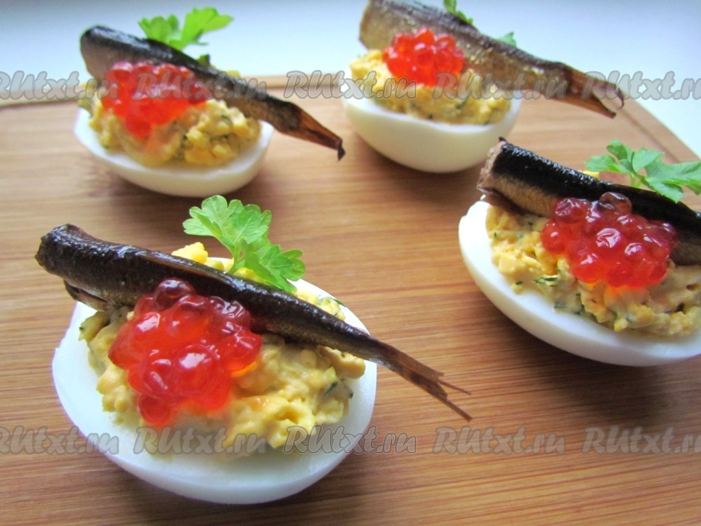 Закуска из фаршированных яиц со шпротами и красной икрой получилась очень вкусной, аппетитной, она отлично смотрелась на праздничном столе!
