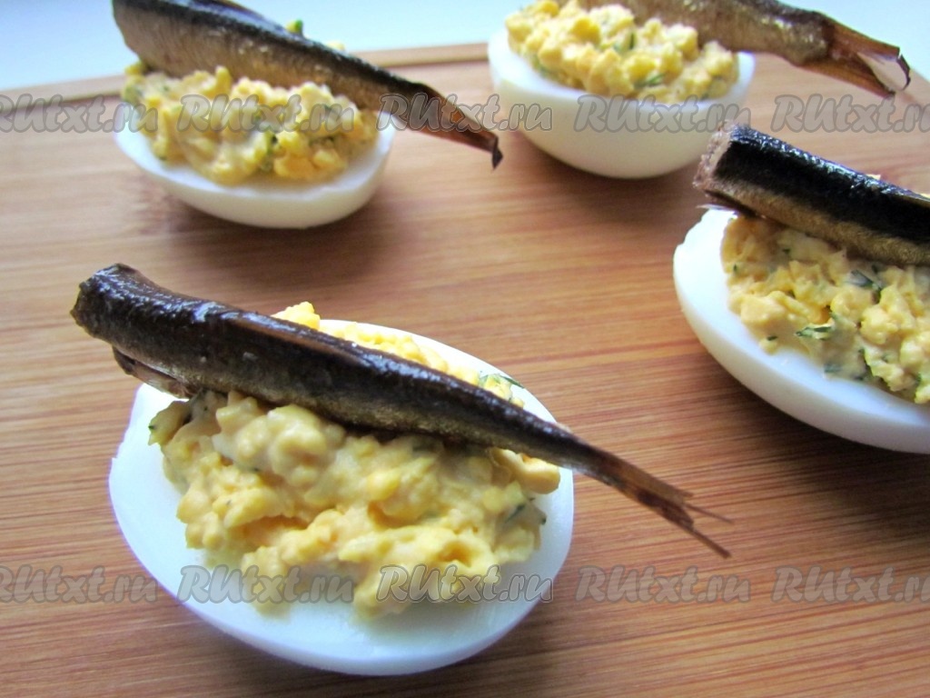 Поверх каждого фаршированного яйца выложить шпротинку.
