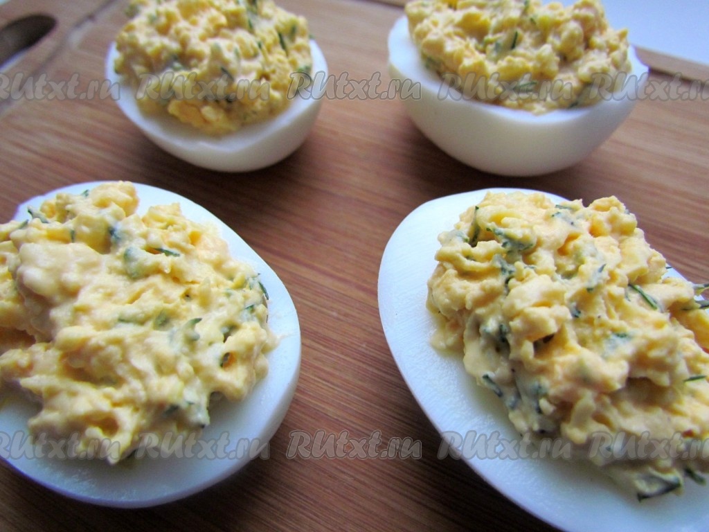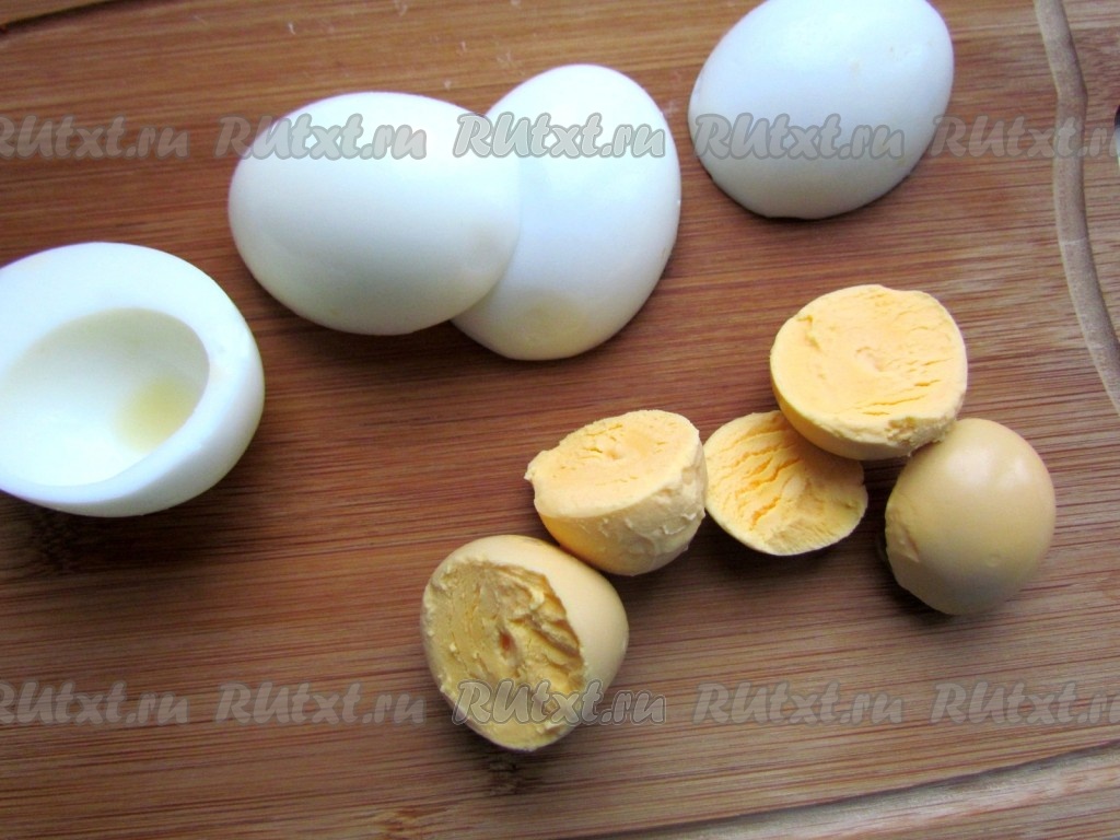 Яйца выложить в кастрюлю, залить полностью водой и отварить в течение 10 минут с момента закипания. Затем остудить яйца в холодной воде, очистить от скорлупы, аккуратно разрезать вдоль на две половины, отделить белок от желтка.