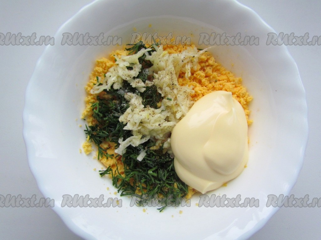 В тарелку с желтками добавить чеснок, укроп, майонез, щепотку чёрного молотого перца, тщательно перемешать. Если нужно, подсолить по вкусу.