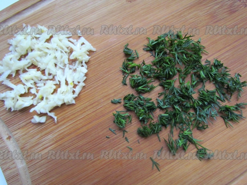 Зелень укропа промыть водой, обсушить, мелко нарезать. Чеснок очистить, пропустить через пресс.