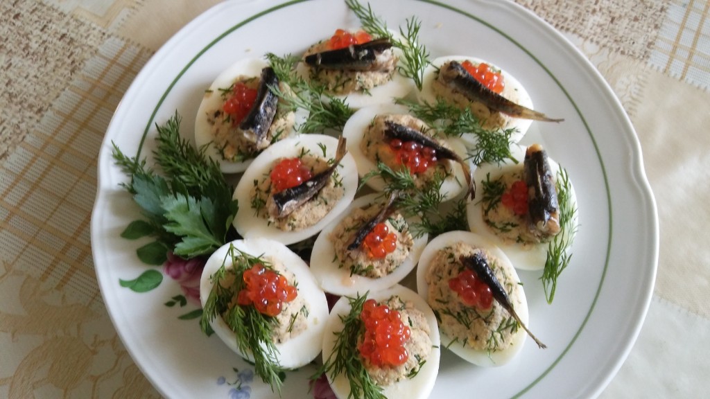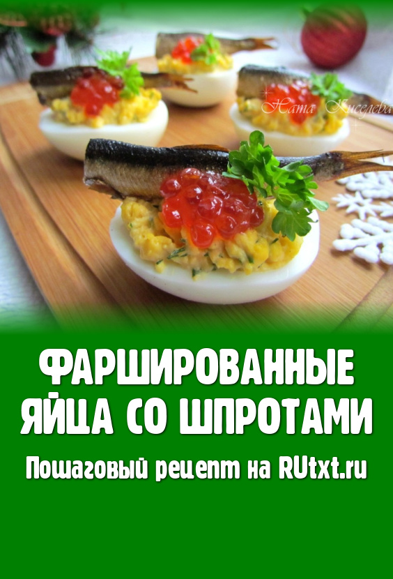 Вариантов приготовления фаршированных яиц очень много. Один из вариантов - это фаршированные яйца со шпротами. Выглядит такая закуска на праздничном столе очень аппетитно, да и на вкус хороша. Перед подачей фаршированные яйца можно дополнительно украсить, например, зеленью. Я подавала их на новогодний стол, поэтому украсила красной икрой. Приготовьте фаршированные яйца со шпротами и вкус этого простого блюда вас точно не разочарует!